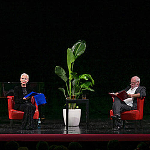 Die beiden Kammerschauspieler Sona MacDonald und Johannes Krisch auf den Spuren des exzentrischen Schriftstellers, seiner Ehefrau Martha Gellhorn und seiner Brief-Geliebten Marlene Dietrich.