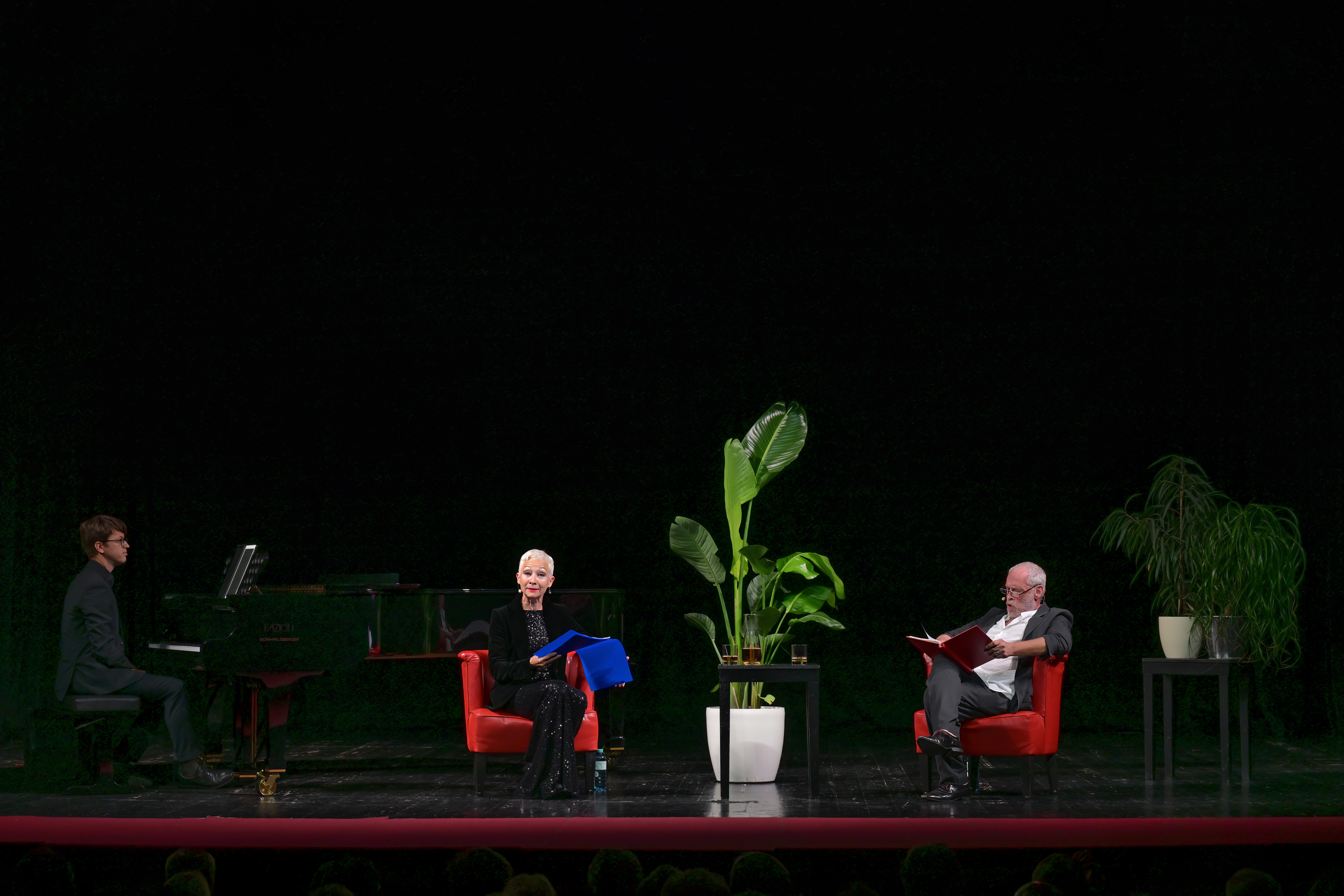 Die beiden Kammerschauspieler Sona MacDonald und Johannes Krisch auf den Spuren des exzentrischen Schriftstellers, seiner Ehefrau Martha Gellhorn und seiner Brief-Geliebten Marlene Dietrich.